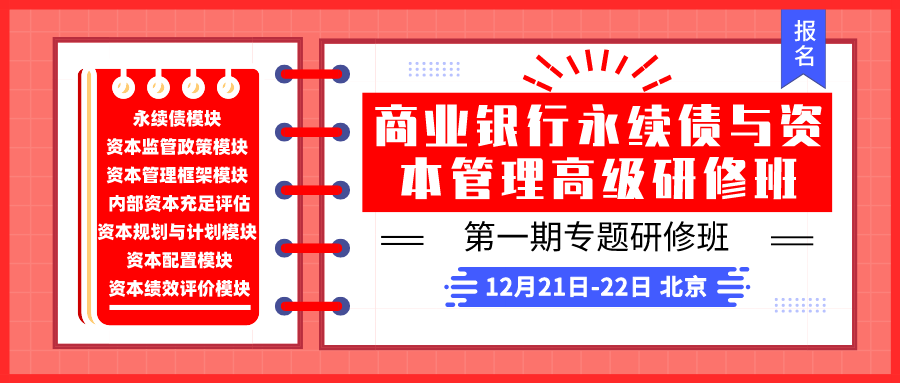 2018年下半年来,为进一步提高银行服务实体经济能力,监管部门加快了永续债等新型资本工具的推进力度,永续债正在成为银行开展资本补充的优先选择品种。为全面提高银行开展外部补充和内部资本管理的能力,有效推动银行整个资产负债表优化和发展模式转型,我们将于12月21日-22日在北京拟举办“商业银行永续债发行与资本管理高级研修班”,内容全面覆盖银行资本补充和管理所有环节,包括永续债发行政策、流程、资本管理架构、资本规划与计划、资本配置、资本绩效评价、国际先进银行管理经验分享等(详见以下课纲),真正提升资本管理人员的战略思维高度和在内部经营管理中的地位。