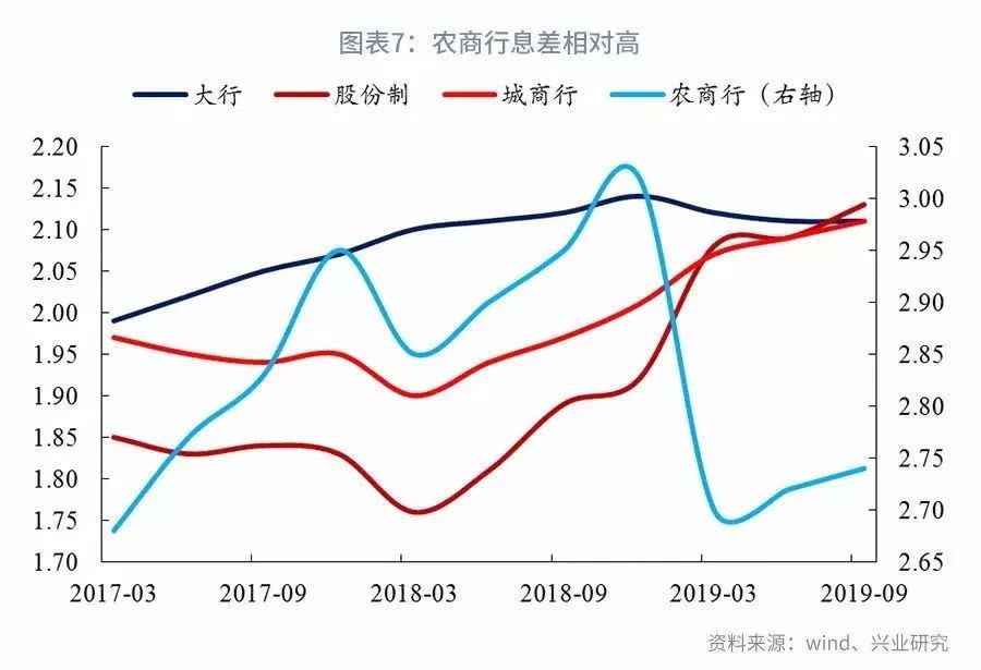 息差维度,全行业整体水平在2.2%左右,国股和城商行息差水平略低,在【2.1%,2.15%】之间。农商行明显更高,在【2.7%,2.75%】之间。考虑到来年货币进一步宽松机会有限,LPR单边调整的影响将在后几个季度逐步显现出来,未来的息差降易升难。
