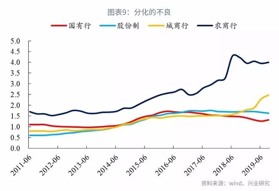 根据银保监会披露的最新数据,3季末全行业利润告别两位数增长,滑落到9%。其中国有大行、股份行增速仍然较高,分比为12%和11%,农商行仅有5%,城商行利润同比增长则罕见地出现了负数,表明城商行整体已经无法通过内生提供资本。