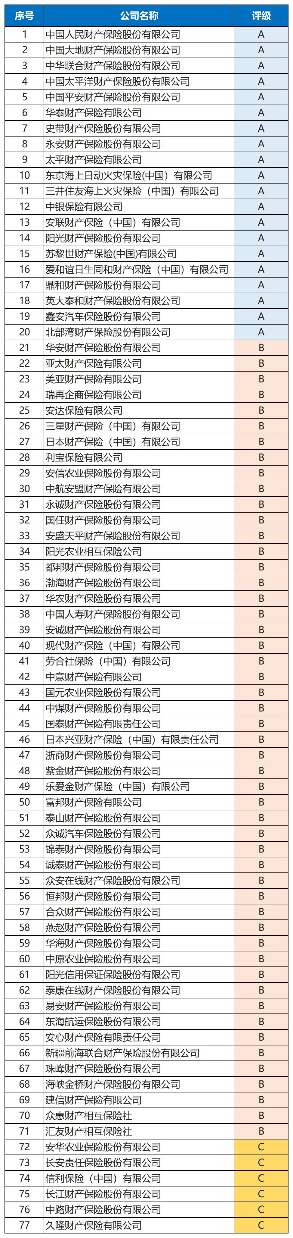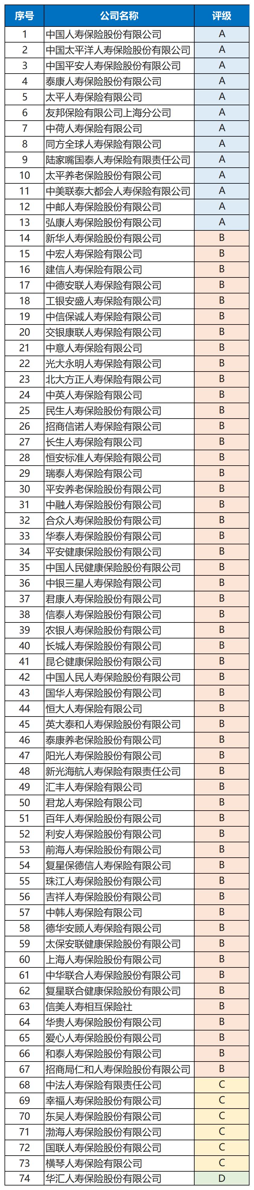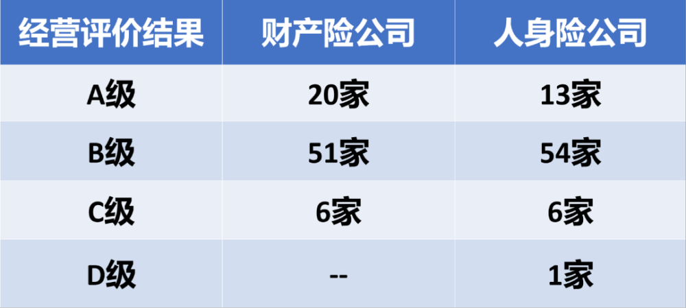 结果显示,在本次评价的保险公司共151家。其中:财产险公司77家,人身险公司74家。财产险公司A类20家,B类51家,C类6家。人身险公司A类13家,B类54家,C类6家,D类1家,为华汇人寿。