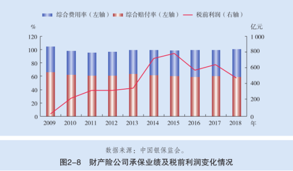 2018年财产险公司综合费用率攀升至40.74%,较上年上升1.18个百分点,综合成本率达到100.13%,承保亏损13.59亿元,为2011年以来首次承保亏损。承保亏损叠加投资收益下滑,财产险公司全年税前利润仅为473.2亿元,同比下降26.02%。