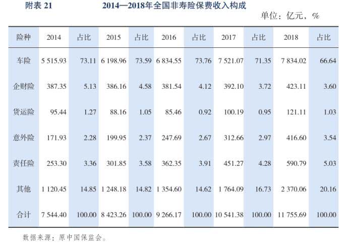 2018年,在新车销量增速下降和商业车险改革导致单均保费下降的背景下,车险业务增速下滑,保费仅增长4.16%,占财产险总保费的比重降至66.64%,较2017年末下降4.71个百分点。