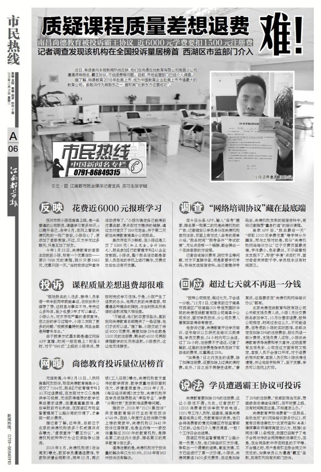 近日,有读者向本报新闻热线反映,他们在尚德在线教育有限公司南昌分公司遭遇诱导报名、“霸王”协议、不给退费等问题。目前,市场监管部门已经介入调查。