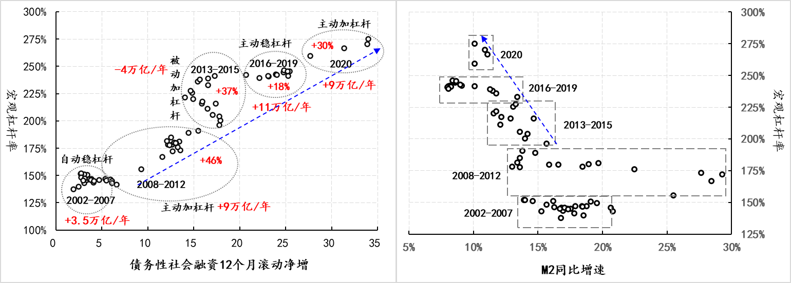 图1 部分市场利率月度最低值 数据来源:Wind但即便金融环境在政策淡出引导下,很快就切换了节奏,2020年中国宏观杠杆率依然在一年之后提高了30个百分点,债务性社会融资的扩张速度一年之内扩大了9万亿/年(由25万亿/年升至34万亿/年),宏观杠杆率和债务扩张速度的变化幅度相当于2014年至2019年的累计幅度,即2020年金融环境的边际宽松程度,为之前6年的总和。因此,从某种意义上而言,中国经济之所以在短短的两个季度内,就将疫情冲出的“缺口”填平,与如此幅度的债务扩张密不可分。