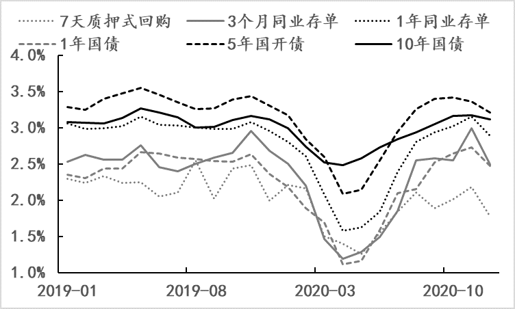 以市场利率为例,在2020年5月中旬之前,受对冲疫情政策的推动(央行将其公开市场操作和MLF的利率累计下调了30BPs),各类市场利率均下探出新的历史低位,之后在疫情平稳的条件下,对冲政策已实现阶段性目标,相应政策面早于市场预期转入了淡出策略,例如监管强化了打击资金空转套利、货币政策重返保增长和防风险的平衡,市场利率相应开始回升,进入2020年四季度,利率已回升至疫情前的水平。