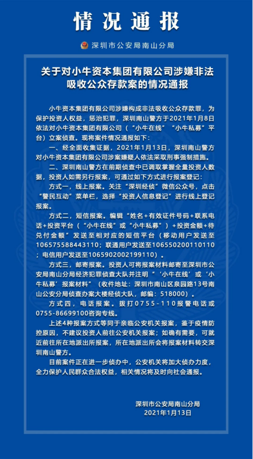 1月13日,深圳南山公安发布通告称,小牛资本集团有限公司涉嫌构成非法吸收公众存款罪,深圳南山警方于1月8日依法对小牛资本集团有限公司( "小牛在线”"小牛私募”平台)立案侦查。1月13日,警方对小牛资本集团有限公司涉案嫌疑人依法采取刑事强制措施。