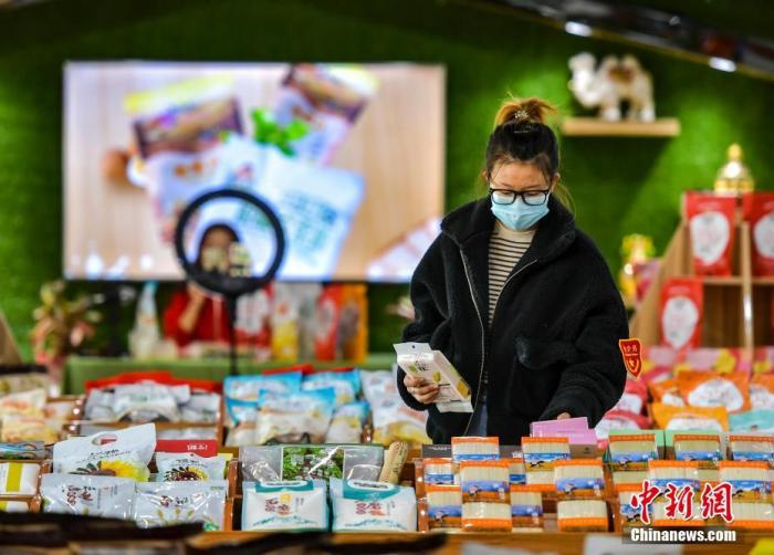 资料图:2020年“双11”期间,新疆一企业展厅内工作人员整理在销的各类农产品。 中新社记者 刘新 摄