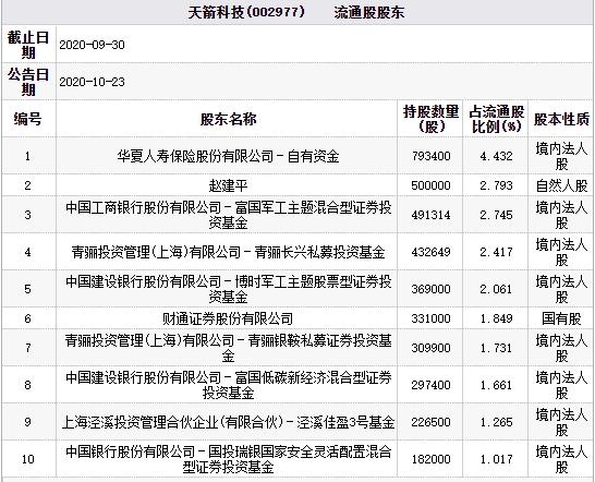 根据公告,截止2020年9月30日,华夏人寿保险股份有限公司,财通证券股份有限公司,富国基金、博时基金、国投瑞银基金旗下公募基金,青骊投资管理(上海)有限公司、上海泾溪投资管理合伙企业(有限合伙)旗下私募基金出现在天箭科技的前十大流通股东中。