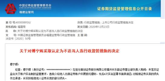 决定书显示,经查,傅宁辉在担任首创证券福州长乐路证券营业部负责人期间,未落实证监会关于账户实名制的监管要求,违规介绍他人出借证券账户开展委托理财,先后4次实名签署书面承诺函,对赔偿证券买卖的损失作出承诺,并实际赔偿他人证券买卖的部分损失。