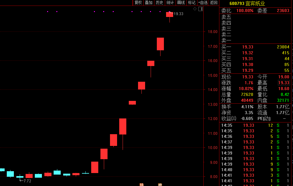 1月18日收盘,位于四川宜宾的宜宾纸业(600793)股价再次封于涨停,为1月6日以来连续第九个涨停,累计涨幅已达134.59%。