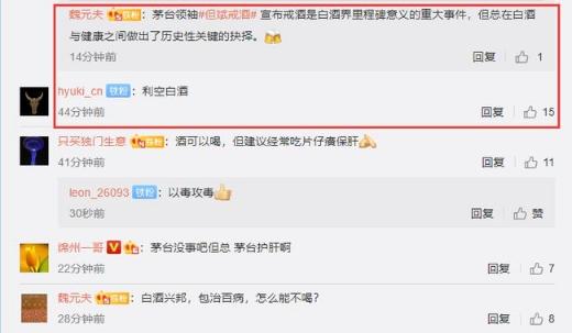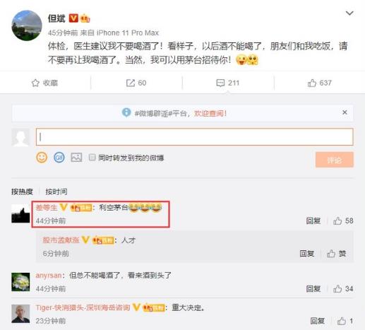 对此,评论区网友纷纷调侃,“利空茅台”、“利空白酒”、“清仓茅台”,还有不少网友开玩笑称“但总,喝酒前要先来一个片仔癀保肝!”