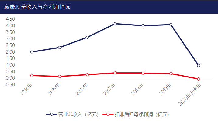 自2017年赢康股份收入达到4.15亿元、扣非后的净利润达到0.40亿元后,公司的收入与扣非后的净利润就已停滞不前。2018年、2019年赢康股份的收入仅为4.00亿元、4.08亿元,较2017年相比,公司的收入没有增长反而出现了小幅下滑。受公司收入下滑的影响,2018年、2019年赢康股份扣非净利润也出现了不同程度的下滑。2018年,赢康股份扣非净利润为0.38亿元,2019年下降到了0.35亿元。