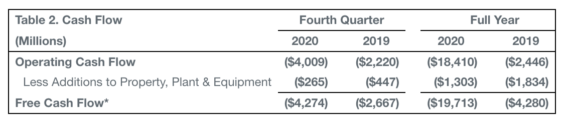 在现金流方面,2020年第四季度,波音的营业现金流量为-40.09亿美元;2020年全年,波音的营业现金流量为-184.10亿美元。
