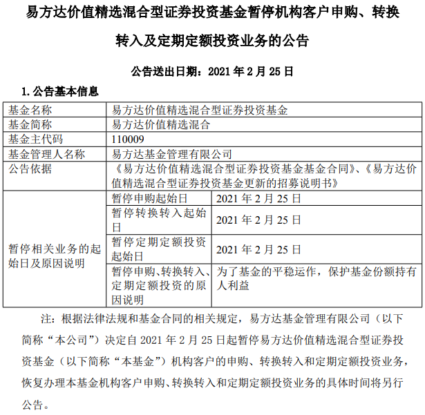 2月24日,易方达价值精选发布公告称,自2月25日起,暂停机构客户申购、转换转入及定期定额投资业务,原因是“为了基金的平稳运作,保护基金份额持有人利益”。