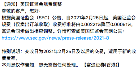 已有用户收到通知,富途牛牛称自2021年2月25日起,同步做出相应调整,交收日为2021年2月25日及以后的交易,适用于新的收费费率。