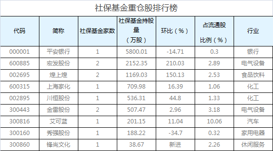 从持股比例看,社保基金持有比例最多的是艾可蓝,持股量占流通股比例为10.06%,其次是金雷股份,社保基金持股比例为3.18%,持股比例居前的还有宏发股份、煌上煌、锋尚文化等。持股数量方面,社保基金持股量最多的是平安银行,共持有5800.01万股,宏发股份、煌上煌等紧随其后,持股量分别为2152.35万股、1169.03万股。