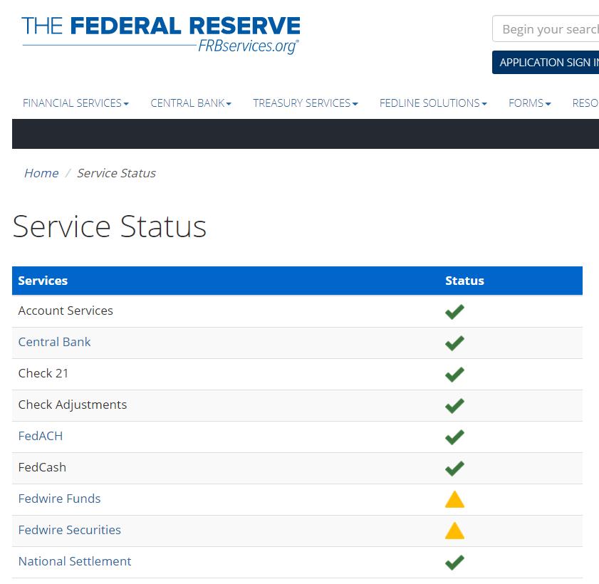 美联储服务网截图美联储运营的网站显示,截至当地时间24日下午7:26,中央银行(Central Bank)、FedCash服务、至关重要的自动清算所系统FedACH以及Fedwire Funds银行间转账服务都已恢复。