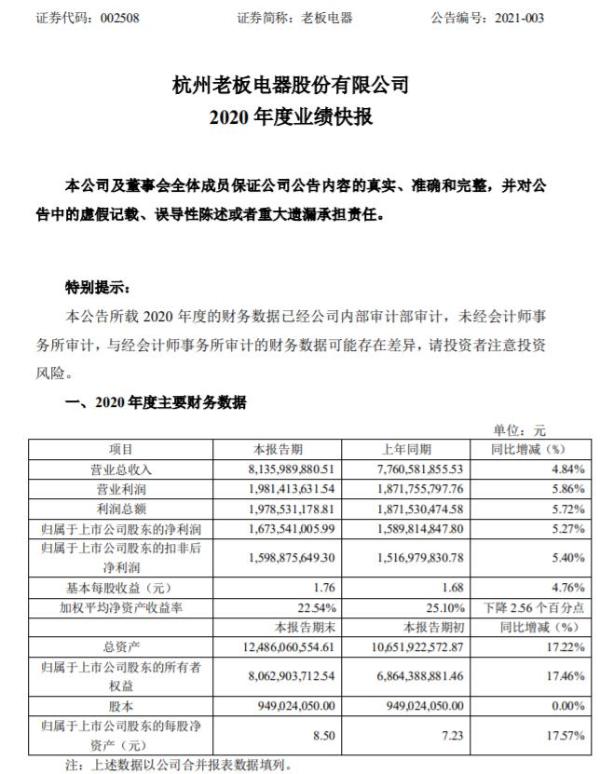 挖贝网2月23日,老板电器(002508)发布2020年度业绩快报公告,公告显示,2020年1-12月营业总收入为8,135,989,880.51元,比上年同期增长4.84%;归属于上市公司股东的净利润为1,673,541,005.99元,比上年同期增长5.27%。