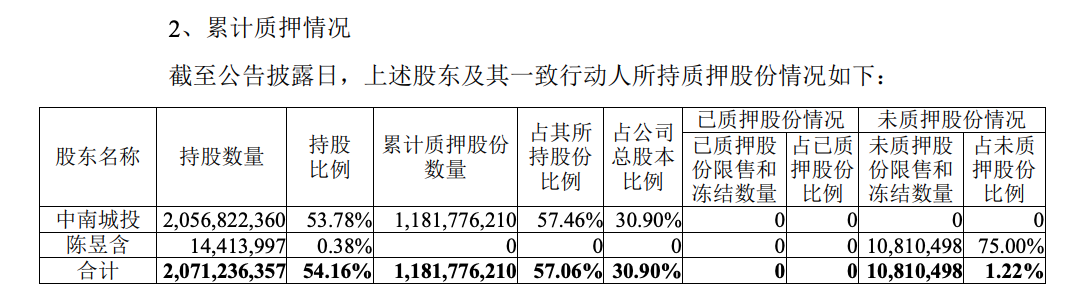 乐居财经讯 陈晨 3月3日,中南建设(000961.SZ)发布公告称,第 一大股东东中南城市 建设投资有限公司(简称“中南城投”)本次质押公司1000万股公司股份,占其所持 股份比例0.49%,占公司总 股本比例0.26%。此次质押为补充质押,质押期限为2021年3月2日至2022 年 12 月 28 日。质权人为中国华融资产 管理股份有限 公司天津市分 公司。