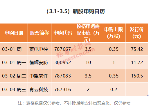 发行节奏上,初步来看周一菱电电控 、恒辉安防申购,周二中望软件申购,周三则有青云科技申购。