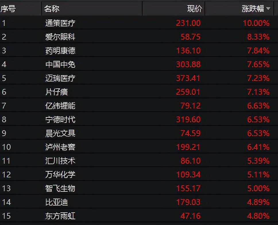 今天上午,成分股中,除了涨停的通策医疗外,爱尔眼科、药明康德、中国中免等个股涨幅同样显著。创业板市值“一哥”宁德时代大涨6.53%,市值排第二位的迈瑞医疗大涨7.23%。此外,茅台上涨2.45%。该股昨日最低曾探至1900.18元。白酒板块中,山西汾酒涨停,泸州老窖、酒鬼酒等涨超6%。
