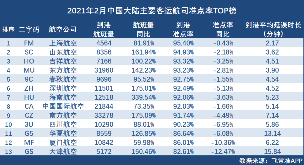 东航和山航分别跻身全球大型航司、中型航司准点榜第3
