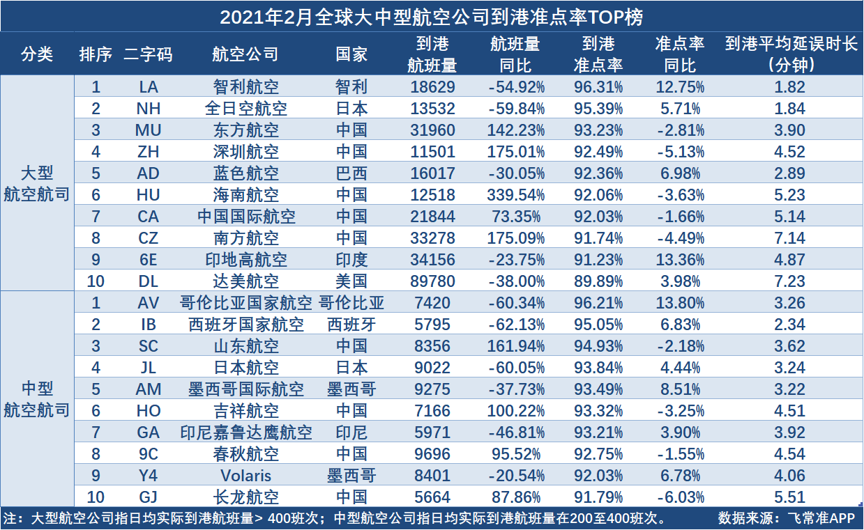 2月全球大型航空公司到港准点率榜单中,智利航空以96.31%的到港准点率成为全球最准点的大型航司,其到达平均延误时长为1.82分钟。全日空航空、东方航空分列2、3位。本期5家中国航司上榜,分别是东方航空、深圳航空、海南航空、中国国际航空和南方航空。