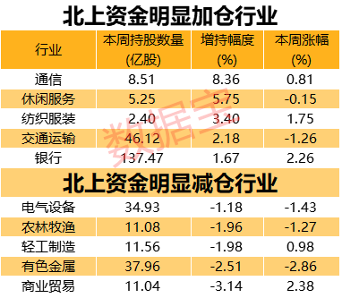 证券时报•数据宝统计显示,本周北上资金持股量环比增加的有12个行业,通信行业环比增幅最大,北上资金最新持有该行业8.51亿股,相比上周末增长8.36%。环比增幅居前的有休闲服务、纺织服装、交通运输、银行等行业。