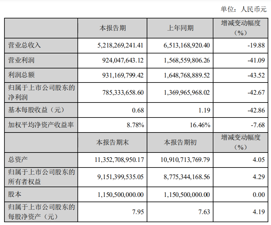 报告期内,公司实现营业收入52.18亿元,同比下降19.88%,归属于上市公司股东的净利润约7.85亿元,同比下降42.67%;基本每股收益0.68元,同比下降42.86%。