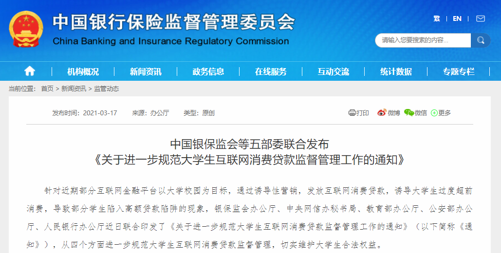近日,中国银保监会、中央网信办、教育部、公安部、人民银行联合印发《关于进一步规范大学生互联网消费贷款监督管理工作的通知》(下称“《通知》”),针对治理部分互联网小贷机构通过诱导性营销发放互联网消费贷款,诱导大学生过度超前消费导致部分学生陷入高额贷款陷阱的现象。