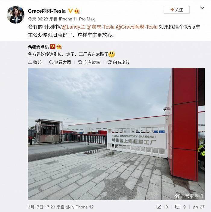 IT之家 3 月 18 日消息 针对网友建议推出 Tesla 车主公众参观日,特斯拉对外事务副总裁陶琳于 3 月 18 日凌晨在其微博回应称:会有的,计划中。