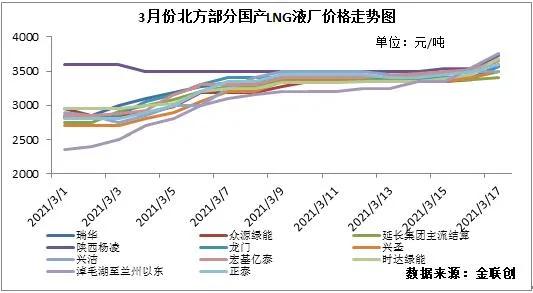 据金联创推算,3月下旬的中石油西部原料气价格为1.78元/吨,主流生产成本或在3170-3450元/吨,较中旬上涨450元/吨左右。3月17日北方液厂主流出厂成交在3450-3730元/吨,较3月16日上涨175元/吨,目前均处在盈利状态。