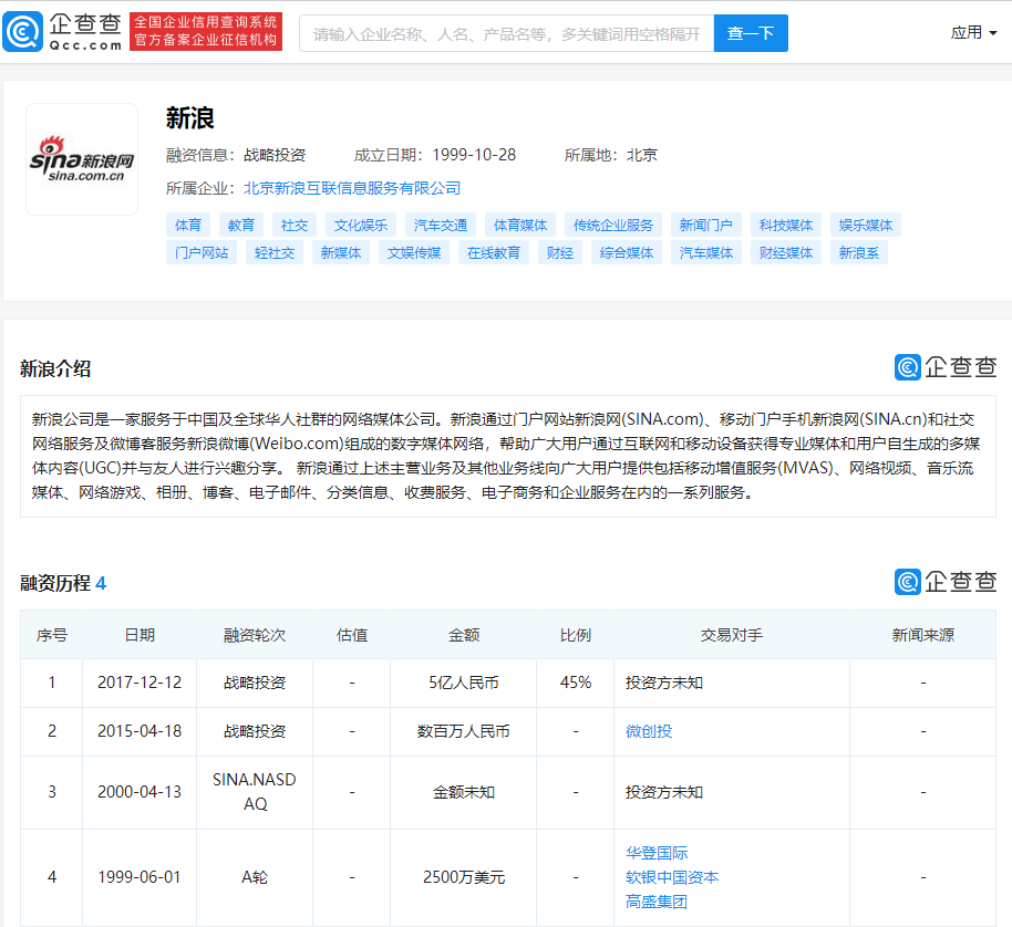 媒体消息,新浪日前完成私有化,从纳斯达克退市。企查查APP显示,新浪成立于1999年10月,注册资本8.2亿元人民币,是一家服务于中国及全球华人社群的领先网络媒体公司。新浪通过门户网站新浪网(SINA.com)、新浪移动(移动门户及移动应用)和社交媒体微博(Weibo.com)组成的数字媒体网络,帮助广大用户通过电脑和移动设备获得专业媒体和用户自生成的多媒体内容并与友人进行兴趣分享。