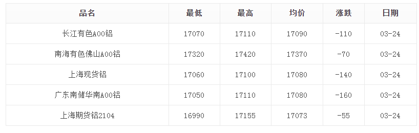 3月24日铝价格隔夜继续下跌,下图是各个地区铝价格下跌情况表,从表中可以看到铝价格下跌幅度还是比较大的。其中广东南储铝的价格下跌了160元/吨,下跌幅度最大,均价在17080元/吨;上海现货铝的均价是17080元/吨,下跌了140元/吨;长江有色铝的均价是17090元/吨,下跌了110元/吨;南海有色铝的均价是17370元/吨,下跌了70元/吨;上海期货铝的均价是17073元/吨,下跌了55元/吨。