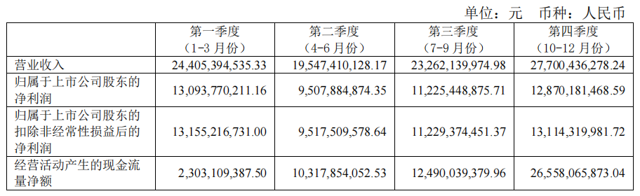 分季度来看,第一季度实现营收244.05亿元,净利润130.94亿元,第二季度营收195.47亿元,净利润95.08亿元,第三季度232.62亿元,净利润112.25亿元,第四季度实现营收277亿元,实现净利润128亿元,创下历史新高。