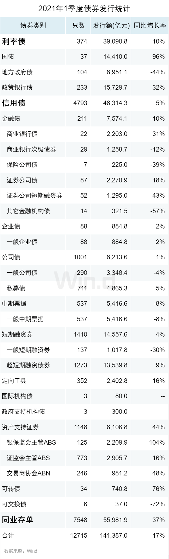同业存单同比增长37%,发行总金额5.60万亿元。2021年1季度各债券类型发行统计如下: