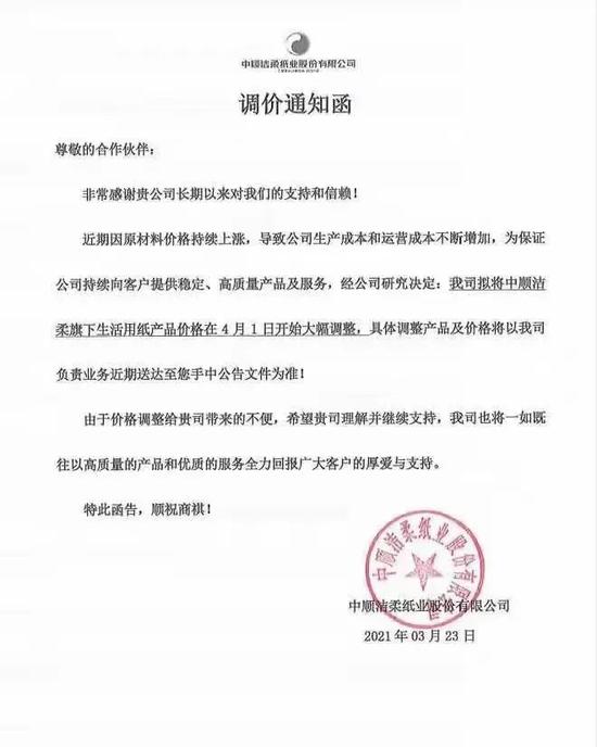 近日,国内知名纸业公司“中顺洁柔”向经销商、渠道商发出调价通知函,从4月1日开始大幅调整旗下生活用纸产品价格。