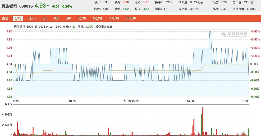 截至4月21日A股收盘,民生银行收于4.93元/股,跌幅0.2%,总市值约2158亿元。