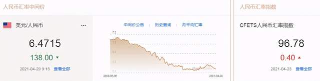 4月29日,人民币中间价报6.4715,上调138点,上一交易日中间价报6.4853,在岸人民币上一交易日收报6.4847。