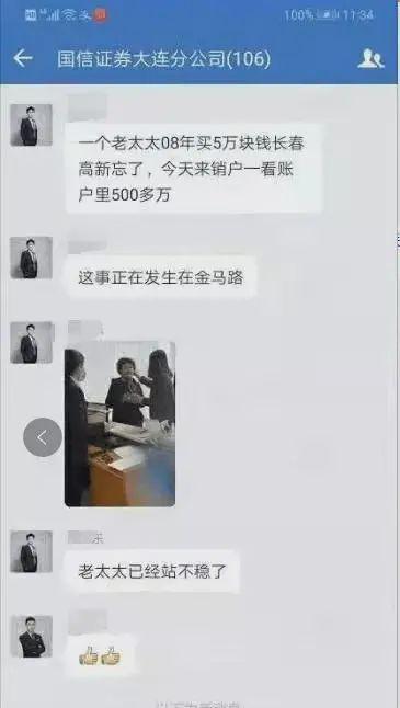 据传,本月23日上午,一名阿姨来到国信证券大连金马路营业部办理业务,因常年在国外已经忘记密码,如今前来销户,赫然发现自己在2008年花5万多元购买的一只股票,如今账户市值已经达到500多万元。阿姨得知消息后受到极大刺激,激动的难以自持、站都不站稳。