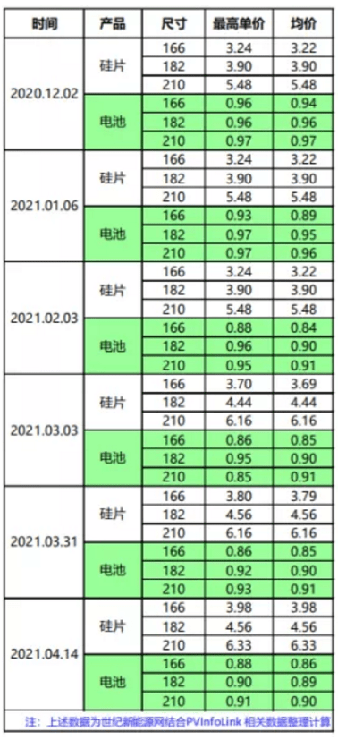 PVInfolink于2020年12月2日的周价格评析中新增182mm/210mm硅片、电池片、组件报价。彼时,对应的最高单价分别为3.90元/5.48元、0.96元/0.97元。