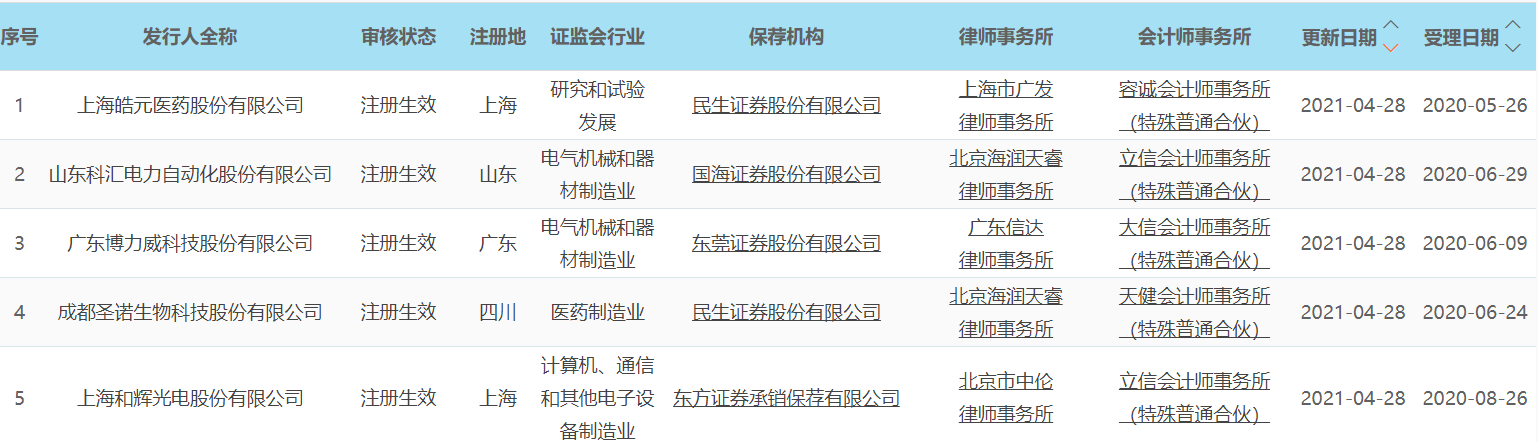 4月29日,资本邦了解到,成都圣诺生物科技股份有限公司、山东科汇电力自动化股份有限公司、上海皓元医药股份有限公司、广东博力威科技股份有限公司科创板IPO审核状态变更为“注册生效”,上海和辉光电股份有限公司更新动态,审核状态仍为注册生效。
