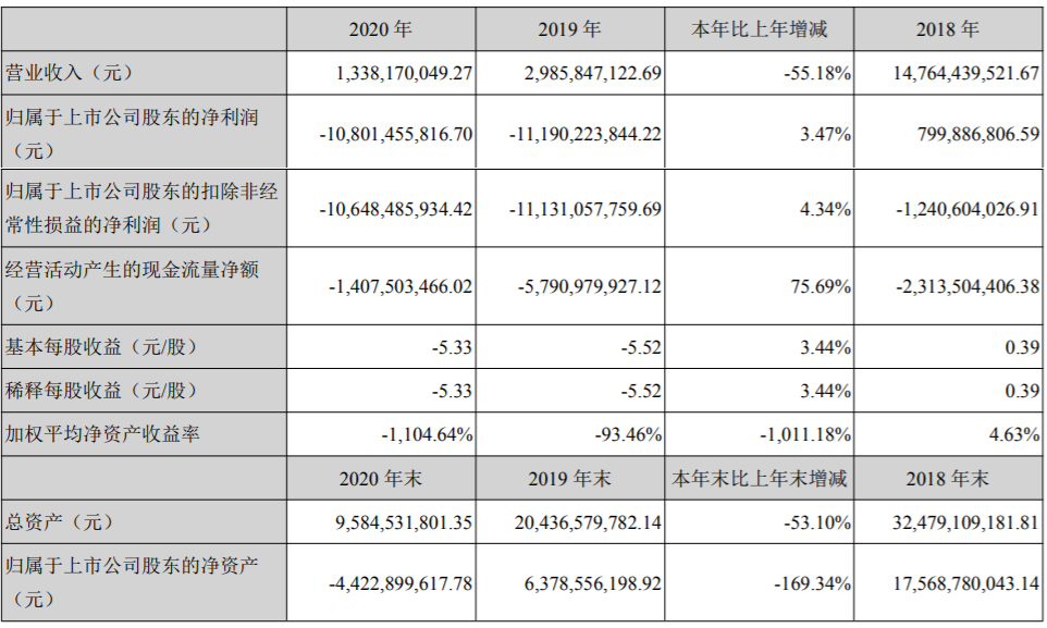 4月29日,资本邦了解到,*ST众泰(000980.SZ)发布2020年年报,2020年实现营业收入13.38亿元,同比下降55.18%;实现归属于上市公司股东的净利润为亏损108亿元,而截至4月28日,*ST众泰总市值仅83.54亿元。