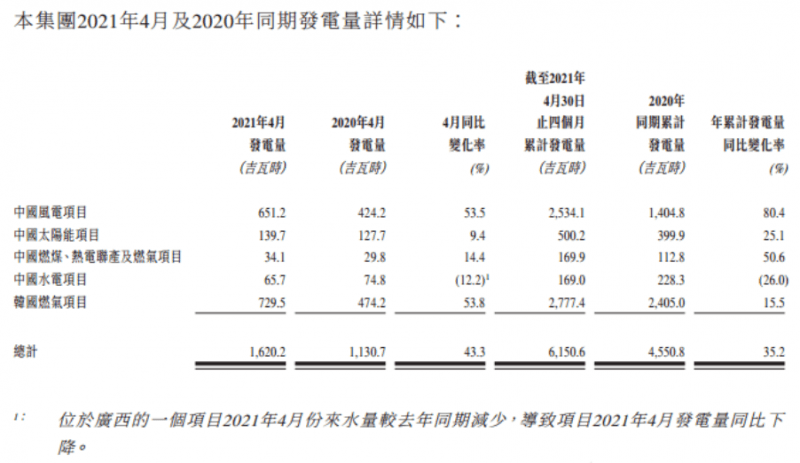 截至2021年4月30日止,1-4月,中广核新能源累计完成发电量6,150.6吉瓦时,比2020年同期增加35.2%。其中,中国风电项目增加80.4%,中国太阳能项目增加25.1%。