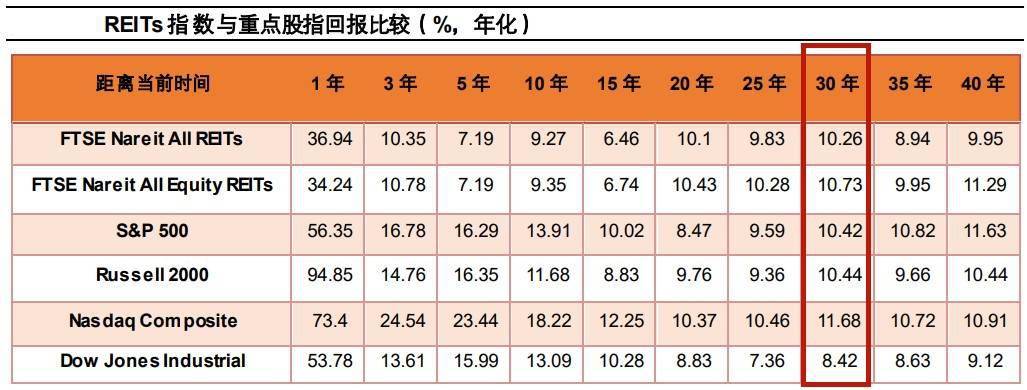 除了降低门槛、丰富投资品种之外,长期来看,REITs产品为投资者带来了稳定、良好的回报。近30年,富时全美REITs指数的年化回报率为10.26%,富时全美权益型REITs指数年化回报率为10.73%,高于同期标普500指数10.42%、罗素2000指数的10.44%和道琼斯工业8.42%。
