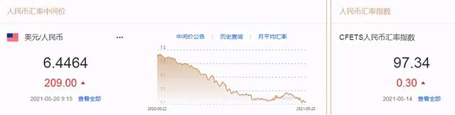 5月20日,人民币(6.4349, 0.0092, 0.14%)中间价报6.4464,下调209点,上一交易日中间价报6.4255,在岸人民币上一交易日收报6.4382。
