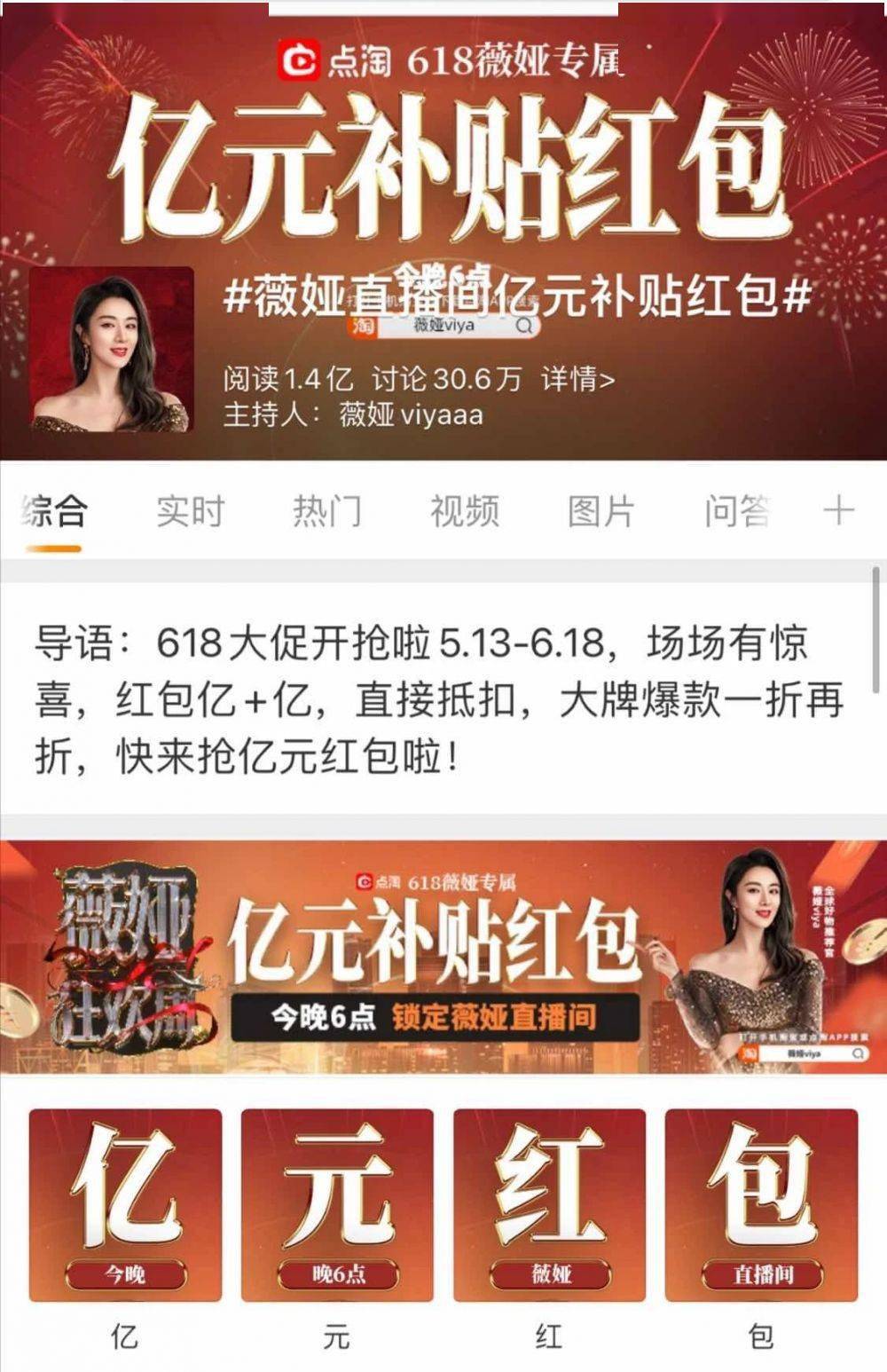 5月21日,薇娅“521薇娅狂欢节”在杭州落幕。微博话题#薇娅直播间亿元补贴红包#阅读量达到1.4亿,讨论30万。