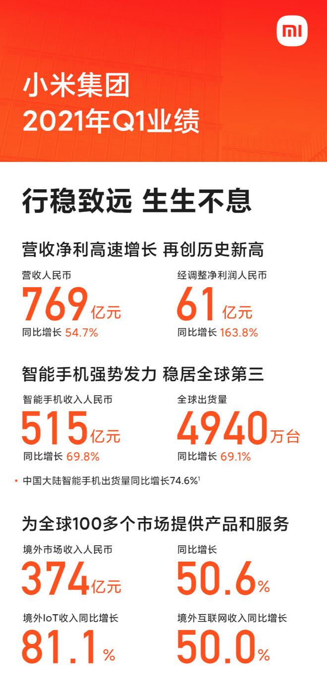2021年5月26日,小米集团公布2021年第一季度业绩。营收利润爆发式增长,远超市场预期。总营收达人民币769亿元,同比增长54.7%;经调整净利润人民币61亿元,同比增长163.8%。“手机 X AIoT”核心战略成效显著,研发投入达人民币30亿元,同比增长61.0%,技术驱动各业务高速增长。