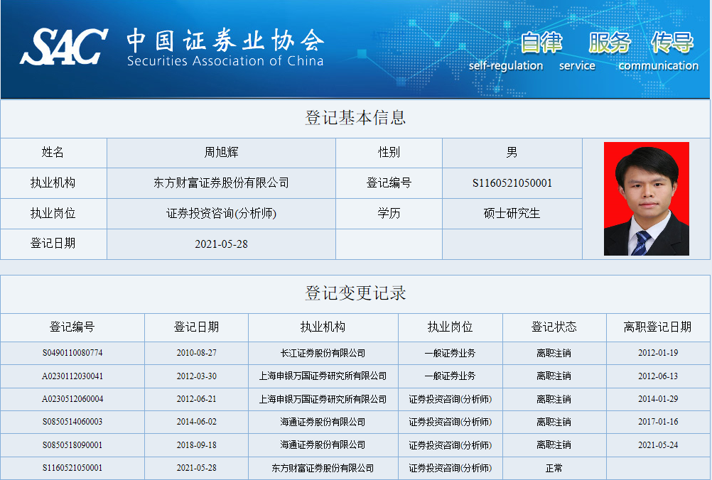 具体来看,中证协官网资料显示,2010年8月27日至2012年1月19日,周旭辉执业机构为长江证券,执业岗位为一般证券业务。2012年3月30日至2012年6月13日,周旭辉执业机构为申银万国证券研究所,执业岗位为一般证券业务。在2012年6月21日,周旭辉在申银万国证券研究所的执业岗位,变动为证券投资咨询(分析师),于2014年1月29日离职注销。