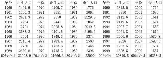 表:60后-00后各年龄段人口分布(单位:万人。来源:第一财经记者根据国家统计局数据梳理)